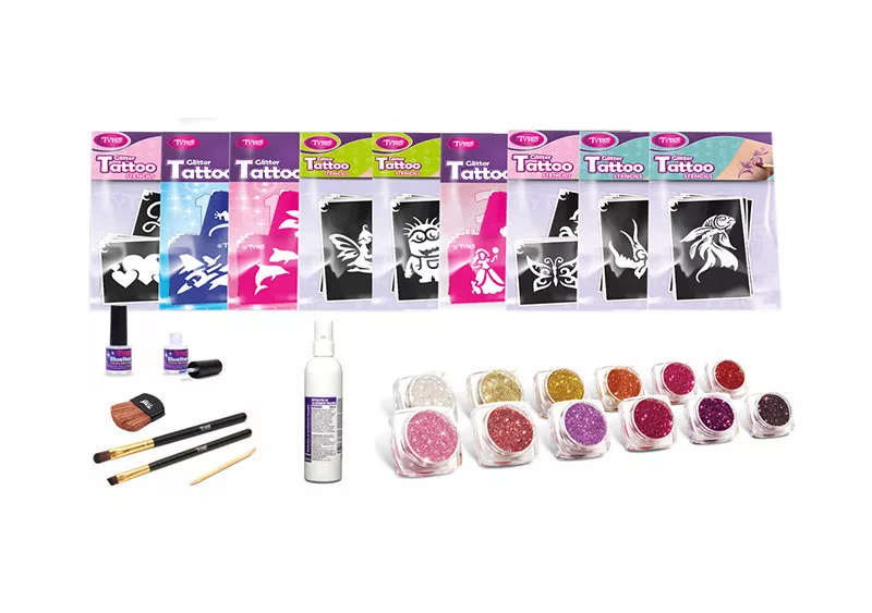 Tartalmazza mindazt, amire szükséged lesz ahhoz, hogy csodás csillámtetoválásokat készíthess. A csomagot lányos és fiús mintasablonokkal vegyesen állítottuk össze, hogy minden gyerek választani tudjon magának mintát, amit megfestesz majd nekik.
